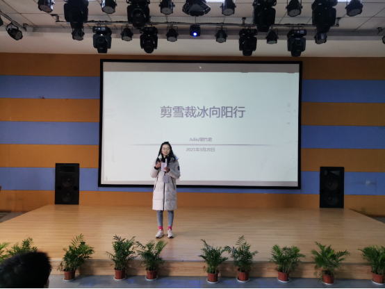 胡竹君以“剪雪裁冰向阳行”为主题,从个人在校经历、十年职场经历、如何看待“打工人”问题、目标和时间管理以及如何面对和处理焦虑五个方面进行了分享。