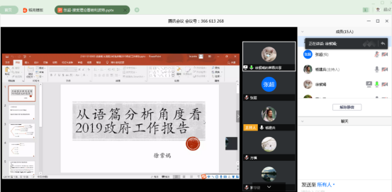 本网讯(通讯员张超)2020年4月18日下午,2018级翻译硕士生线上创新论坛顺利举行,由杨建兵老师主持,并与李琼和陈玢两位老师组成老师评议组。参加本次线上论坛员工共13人,分别为徐紫嫣、吕舜、胡艳、张超、徐新丽、黄玉海、余金燕、罗厚健、曹红霞、杨丹琼、曹良娣、方禛和徐圣俊(按学号顺序),分成三个小组,陈述时间为十五分钟,员工讲述完老师再分别点评,并给出实质性指导建议。整个时间长接近4个小时。