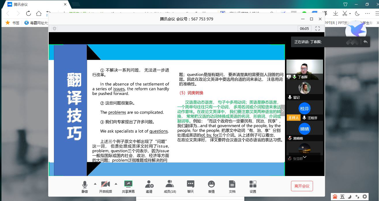 丁春晖以“政论文体的翻译”为主题开讲,向大家分享了他在这方面的理解,陈明芳经理建议他可以提出一些错误的例子予以佐证,增强论证力度。无独有偶,李云龙也从“中国翻译史”的角度谈论了政治对翻译的影响。何广惠老师指出可以抛开综述形式,深入地去分析某一个具体点;陈经理就文本转换、意识形态为谁服务、当下语境影响选择等方面做了补充。施晴晴以目的论为指导,以《简爱》翻译文本为例,剖析了翻译失误现象。汪桂芬老师为大家解释了理论和文本是否合适这一共同关心的话题,同时建议要增强学术语言的应用。张雪群结合实际工作领域,指出中英文建筑词汇不对应等问题,提出根据图纸确定词义等处理方法。程婷霞以高低语境视角下的翻译策略的使用为主题,从五个方面分析了不同语境下的翻译策略。赵婷婷从电影翻译现状入手,总结了电影字幕翻译技巧及策略等。朱俐帆别出心裁,探讨了西非民间故事汉译策略,详细介绍了相关理论和文学背景知识,使同学们大开眼界。