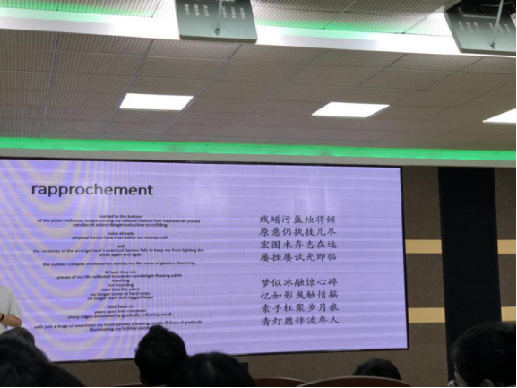 李教授以“内容为王:以译诗和过节论跨文化传播的新理念、新挑战、新机遇”为主题,结合自己遇到的跨文化事件,围绕信息的传播和诗的翻译展开讨论。讲座一开始,李教授就出了一道考眼力小测试题,以此引导大家积极互动,看似考眼力,实则考察归纳总结的能力,他解释,每种文化就是一套编码,其内部都有属于自己的规律,这个规律构成一幅文化地图。接着,他从传播学视角引发跨文化交际的讨论,指出在文化传播的四个基本要素中,信息为重点,其中信息的内容又是核心。随后,李教授用其友人所赠与的诗以及他对诗的翻译作为例子,向大家展示了诗歌中所体现的中西文化差异。借用诗歌的原文和译文,李教授表明了在翻译过程中对诗人的了解以及对诗歌产生背景的了解的重要性,引出了诗歌的原文和译文所代表的不同文化。然后,李教授借用诗人John Pond Ordway的一首诗Dreaming of Home and Mother及其中日两个著名译本向大家解释了何为“风骨”,带领大家领略了不同文化中人们对于意境和情感的不同表达。最后,他总结了跨文化与文化比较不同,跨文化是指多种文化共同生存,在跨文化传播的过程中要结合实际情况,做到既能入乡随俗,When in Rome, do as the Romans do,又要有自己的mono-culture space,做到不卑不亢。