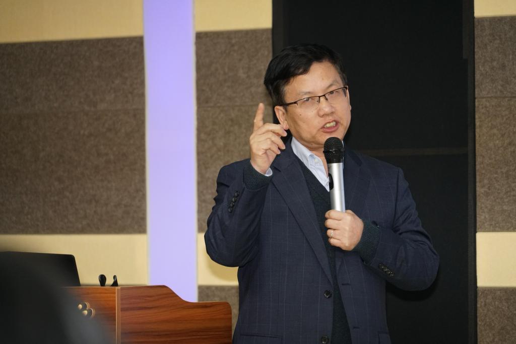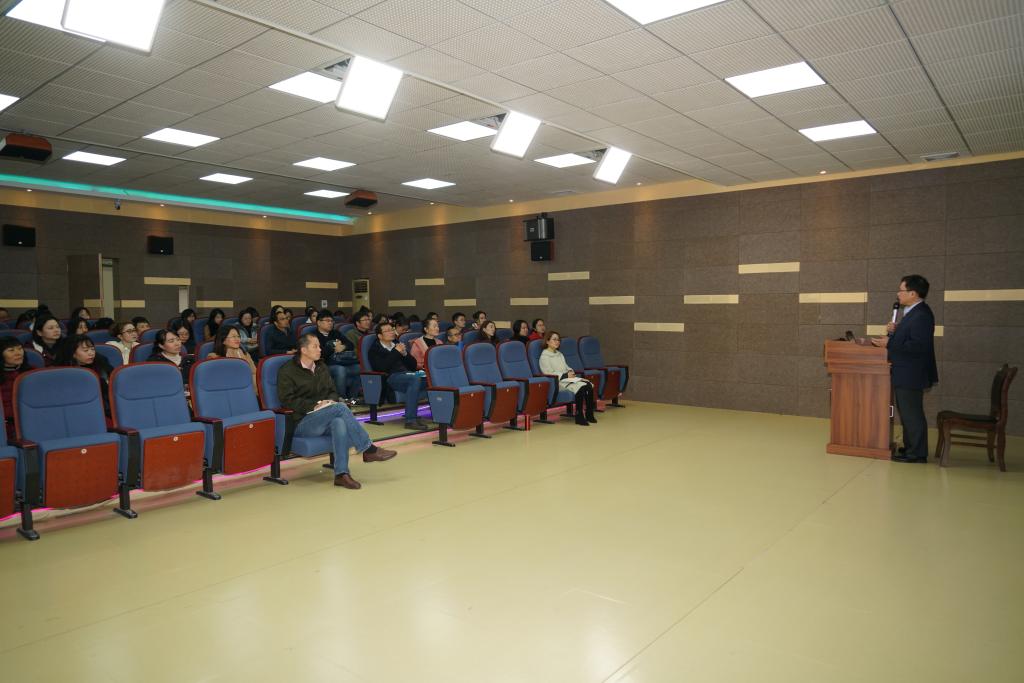 胡开宝教授以“新时期大学外语教师发展:问题与路径”为题,为公司师生详细介绍了极具特色的上海交通大学外国语公司教师发展模式。让公司师生了解到新时期外语学科发展在人才培养、学术研究、社会服务、文化引领等方面之忧以及新时期大学外语学科教师所面临的资源多样化、中学教学水平高、大学外语地位削弱等多方面的挑战的同时,还指明了教师发展的途径:一是立足教学开展教学研究,尤其是课堂教学研究,如课堂教学话语研究、基于语料库的翻译教学研究等;二是根据研究兴趣和研究能力选择合适的学术研究方向,开展学术研究,如生命伦理、功能语言学、翻译认知等外语学科之文学、语言学、翻译学方向的研究前沿。胡教授还重点介绍了上海交大在政策引领和团队支持等方面对于教师发展的重要贡献。