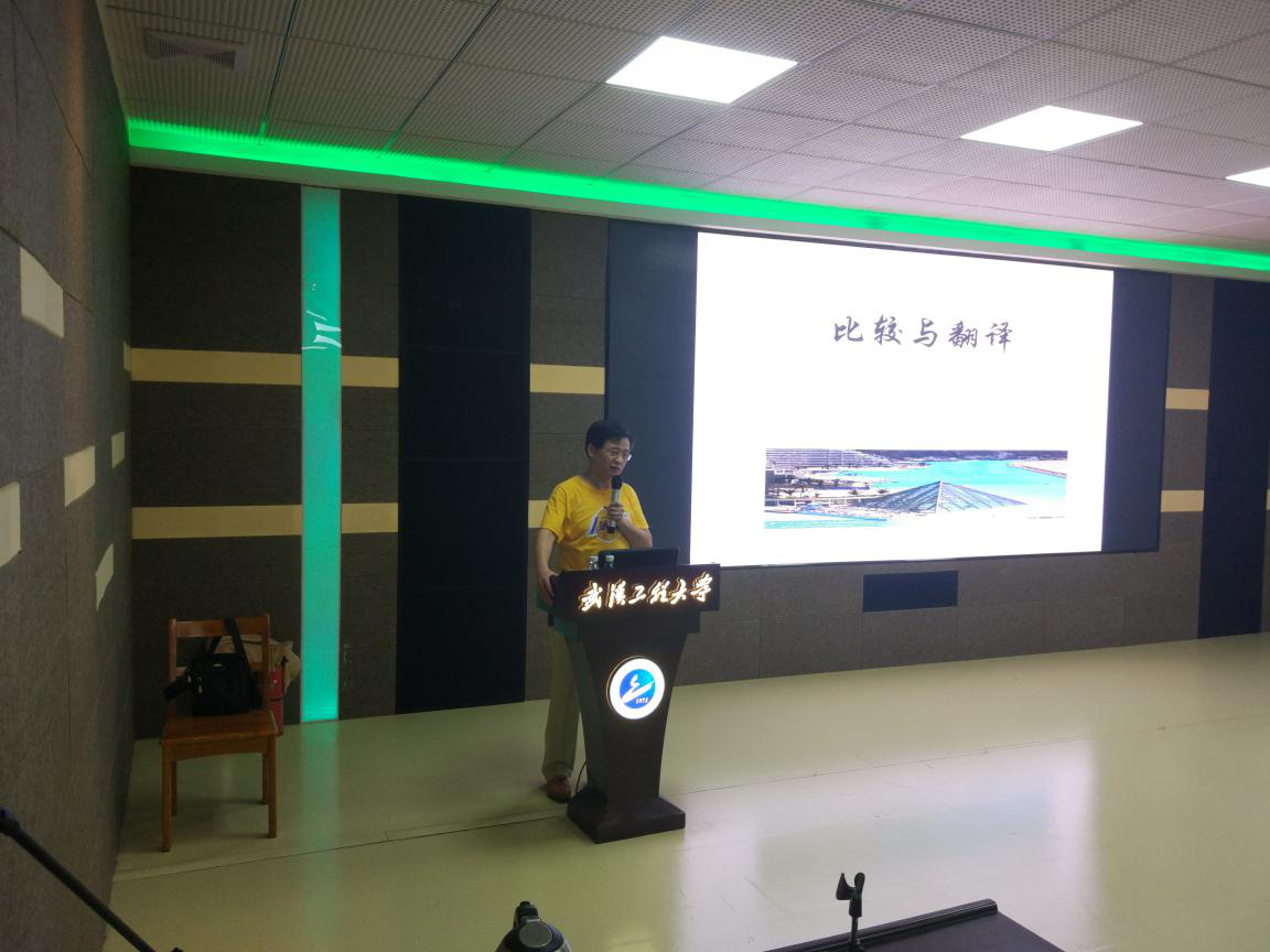 华教授主要从语音、书写、词汇、句法、语篇5个角度对英汉语言的共性和差异进行了详细解析。华教授指出英汉语言在语音层面存在不小差异,而音与义在一些情况下也是有联系的;书写层面,在宏观上两种语言属于不同的书写体系,在翻译时,华教授例举了一些有趣的特殊英语字母和汉语文字的处理;在词汇层面,华教授指出英汉语都有庞大的词汇量,英语专业员工要记忆不少于1万个单词;在句法层面,华教授对英汉句法组合的差异进行了简单探讨。在语篇层面,他指出了主位和述位对学习英语语篇的意义。接下来,华教授讲解了英汉译文之间的比较,最后华教授比较了主要的中外译论。