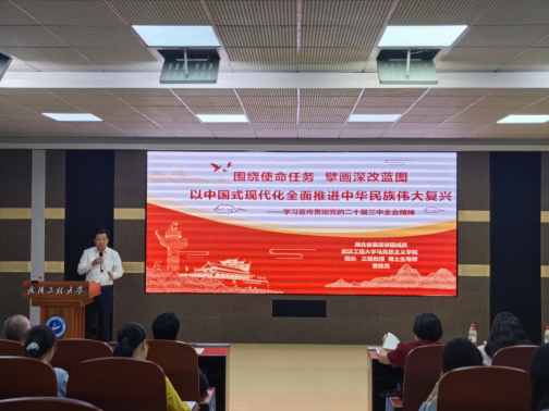 曹胜亮以“围绕使命任务,擘画深改蓝图,以中国式现代化全面推进中华民族伟大复兴——学习宣传贯彻党的二十届三中全会精神”为题从四个方面作专题报告,一是先修知识,我们一起温习。回顾了党的十一届三中全会和十八届三中全会召开的有关情况,并聚焦全面深化改革指出了党的二十届三中全会召开的重大意义。他指出,深入领会全会精神,首先要深刻理解习近平新时代中国特色社会主义思想的精髓要义,尤其掌握“五位一体”总体布局和“四个全面”战略布局的基本内涵,这些是学习领会全会精神的重要基础。二是讲话精神,我们一起领会。从全会基本情况、全会筹备过程、深入学习领会习近平总书记在党的二十届三中全会上发表的重要讲话精神三个方面,讲述了全会召开的概况,重点阐述了习近平总书记发表重要讲话的精神实质。三是改革举措,我们一起学习。着重从深刻认识全会主题、进一步全面深化改革的指导思想、进一步全面深化改革的总体目标、进一步全面深化改革的发力点和着力点、进一步全面深化改革的重大原则、进一步全面深化改革的重大举措、进一步全面深化改革应当把握的一些重大问题等方面,全面系统阐释了《中共中央关于进一步全面深化改革、推进中国式现代化的决定》文本内容。四是展望明天,我们一起践行。学习宣传贯彻全会精神,要加强研究阐释,广泛宣传动员,把学习贯彻全会精神同学习领会习近平总书记关于全面深化改革的一系列新思想、新观点、新论断结合和贯通起来,要结合湖北实际全面深化改革,进一步全面推进中国式现代化的湖北实践,以钉钉子精神抓好各项改革任务的落实。