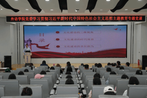 王火利在讲授专题党课时指出,一是以三维视角审视文化建设的重要性,从理论、历史、实践三个角度综合来看,文化建设在中国特色社会主义事业建设中具有举足轻重的地位和作用,既是推进中国式现代化的重要组成部分,又为推进中国式现代化提供了精神动力。二是准确把握文化建设的时代使命,党的二十大报告为文化建设指明了前进方向,即建设具有强大凝聚力和引领力的社会主义意识形态、广泛践行社会主义核心价值观、提高全社会文明程度、繁荣发展文化事业和文化产业、增强中华文明传播力影响力。作为高校院系基层党组织,要引导全体师生深刻领悟文化建设的时代要求,坚持以文化人,切实肩负起应有的时代责任和使命。三是立足实际贡献文化建设力量。beats365的学科专业与文化建设联系紧密,全院师生应当增强使命感和紧迫感,按照党和国家关于文化建设的要求,立足工作学习实际,勇做新时代文化建设的忠实践行者,特别是在中华优秀传统文化传承、中华文化国际传播等方面,充分发挥学科专业优势,力争为文化建设事业做出新的更大贡献。