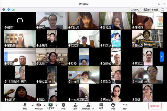 教工第一党支部的田野老师结合自己的线上教学经历和抗洪抢险经历分享了自己作为一名党员的思想历程,他说:“我觉得作为早已安家在武汉的新武汉人,我有责任和义务保卫我们的大武汉,我们的家园!今年40岁的我已不在年轻,但我干劲儿十足,在未来的岁月中我要更积极主动为院里出力,为教研室和党支部分忧!”