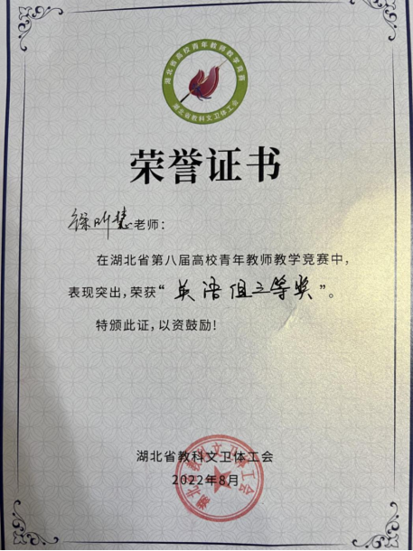 (通讯员徐昕慧)2022年8月24日至26日,湖北省第八届高校青年教师教学竞赛在中南财经政法大学举行。此次竞赛由湖北省总工会、湖北省教科文卫体工会主办,中南财经政法大学承办。湖北省教科文卫体工会主席胡东红表示,湖北省高校青年教师教学竞赛是迄今湖北省教育系统工会组织举办的规模最大、规格最高的教师技能竞赛。这次“大比武”活动形式新颖,亮点纷呈,充分展示了湖北省高校青年教师队伍的教学能力和教学水平。公司新进教师徐昕慧获本次大赛三等奖。