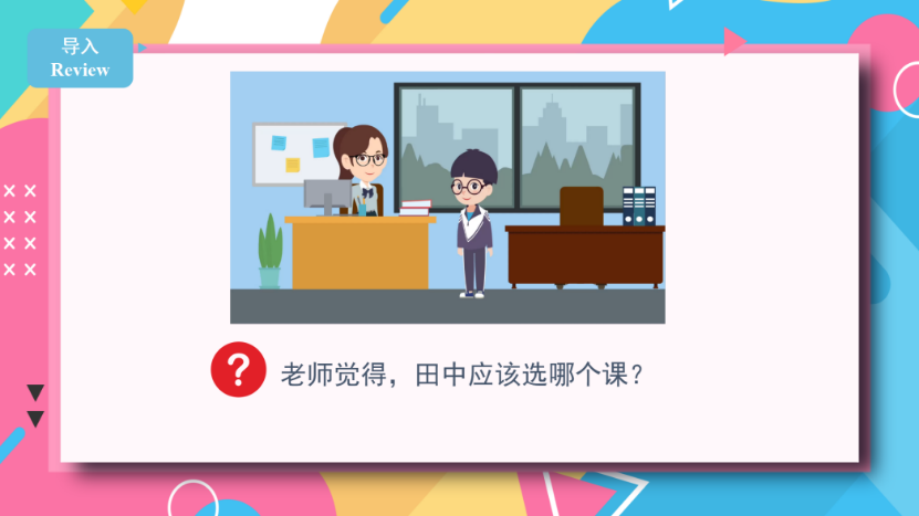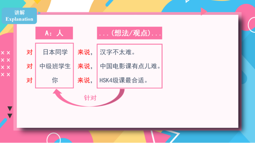 讲解语法点“对A来说”,教学结构包括“旧词复习、新课导入、知识讲练、总结、作业”五个环节。精讲多练,通过短动画来营造良好的语言环境,帮助员工理解该语法点的形式和用法。