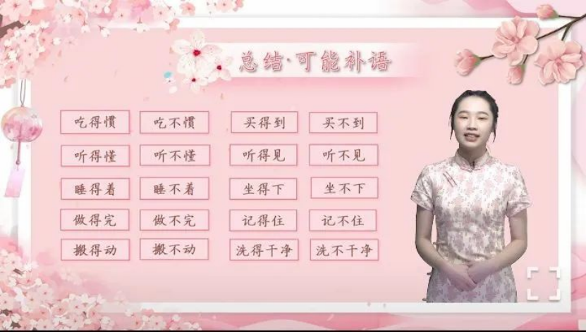 讲解“看得懂,听得懂,拿不动,进不去”等可能补语的用法。首先通过对话录音展示,讲述一个生动有趣的小故事引出可能补语并讲解语法点;再创设情境,进行两个对话录音练习和一个对话问答练习;最后通过小视频引出旗袍文化点,并布置新颖特别的作业。