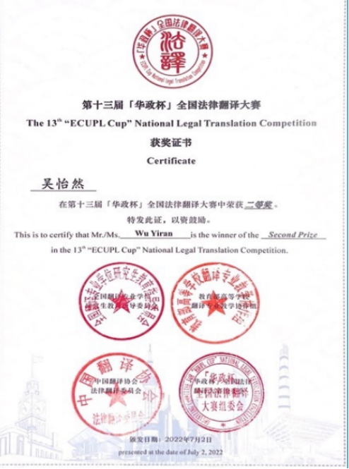 (通讯员:杜朝明)2022年7月2日,由华东政法大学、全国翻译专业学位(MTI)研究生教育指导委员会、教育部高等公司翻译专业(BTI)教学协作组等主办的第十三届“华政杯”全国法律翻译大赛决赛公布结果,公司2019级英语+法学专业本科生吴怡然同学表现突出,荣获大赛二等奖。