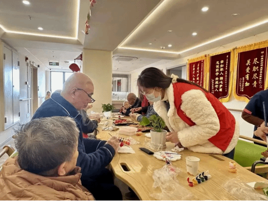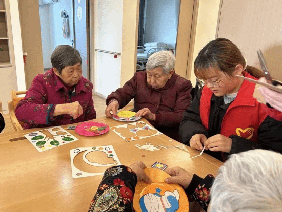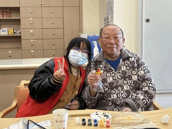 志愿者们和老人们边话家常边给石膏娃娃涂上斑斓的颜色。有的老人手脚不便,志愿者们便耐心地蹲下来扶着他们的手,帮助老人们把石膏娃娃一笔一画涂满。现场一派和乐融融,老人们脸上也洋溢着幸福的笑容。
