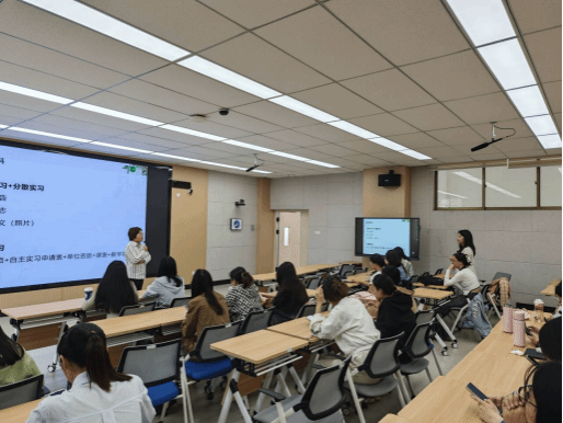 大会上孟老师详细介绍了集中实习和分散实习的具体情况、实习流程、实习材料撰写等事项,并就同学关心的实习时长、指导老师等问题一一进行了解答。会议最后,孟丽鼓励大家积极参与专业实习,并将所学化为所用,在实习中积累自己撰写论文、准备考研的经验。