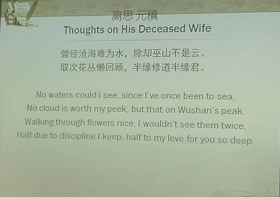 Afterwards, Professor Xie got to the point bysharing his two works to the audience. The first poem was Thoughts on HisDeceased Wife, which was received warm response, followed by the Spring Hike:To the Tune of Think of the Imperial Country, the second poem, which wastranslated by himself.