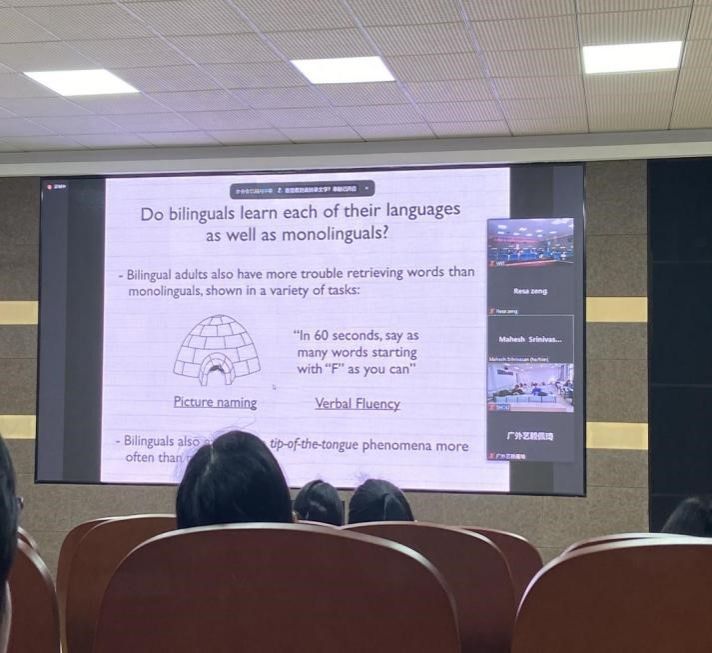 本次讲座带领大家探究儿童是如何习得语言的基本发音、语法规则等有关语言的方方面面。通过此次讲座,大家感受到了语言学和心理学的独特魅力,与会师生拓展了国际视野,并对认知心理学有了更为深刻的理解。Mahesh Srinivasan教授的讲座生动有趣,引人深思,给在座的师生留下深刻的印象。此次学术报告圆满结束。