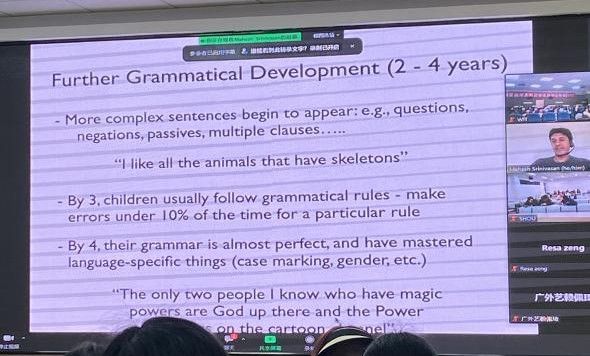 首先,Mahesh Srinivasan教授介绍,语言为研究人类的心理、大脑提供了一个理想的切入点。接下来,基于自身对行为主义理论、认知革命等概念的独特理解阐明了语言能力发展的传统路径、环境在语言发展中的作用和语言学习的关键时期等内容。其中,以大量丰富深刻的例证为依托,向大家生动展现了儿童在不同时期的语言特点。之后,教授进一步介绍有关语言能力发展的各个方面,包括语音的感知、单词的学习、语法的发展等。通过讲座,在座师生了解心理学家用来探究幼儿能力和知识的许多不同的方法。此外,讲座还探讨许多有趣的话题:先天和后天如何在语言习得中相互作用,儿童是否比成人更擅长学习语言,其他动物是否能够使用语言,以及儿童同时学习多种语言的后果等。