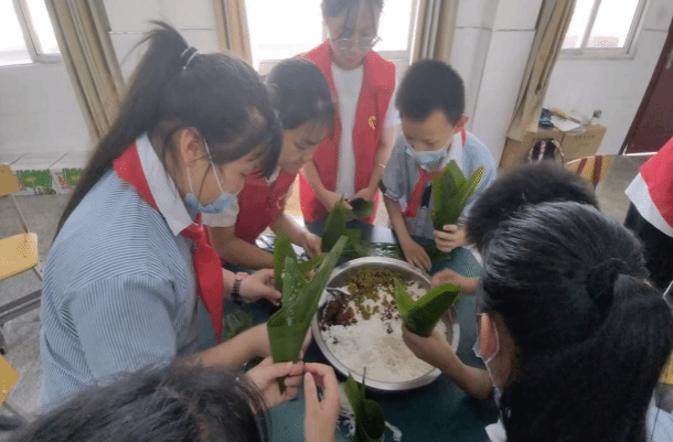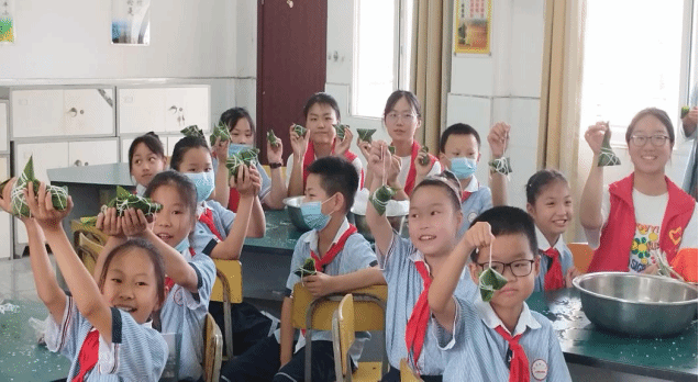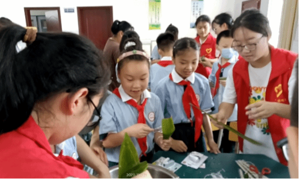 此外,课堂还设计了“沉浸式”体验教学环节,志愿者们手把手教小朋友包粽子,引导孩子们用心感受端午节的文化意蕴,提升孩子们的爱国意识和文化自信。“先把粽叶折叠成漏斗形状,将糯米和蜜枣放在粽叶中,折叠粽叶把糯米全部包住,用麻绳捆紧,这样就做好一个啦,我们一定要认真的包好粽子送给你们最喜欢的老师还有爸爸妈妈!”志愿者一边传授制作粽子的方法,一边耐心的鼓励孩子们认真学习、积极动手。