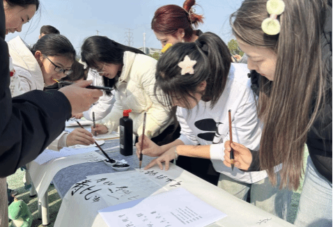 英语专业和汉语国际教育专业的同学们用甲骨文、英语、日语等语言书写各式各样的女生节祝福。在扇子和挂件上一撇一捺的勾勒,加上精心的排版设计,女生们创作出一幅幅独具特色的文创作品。