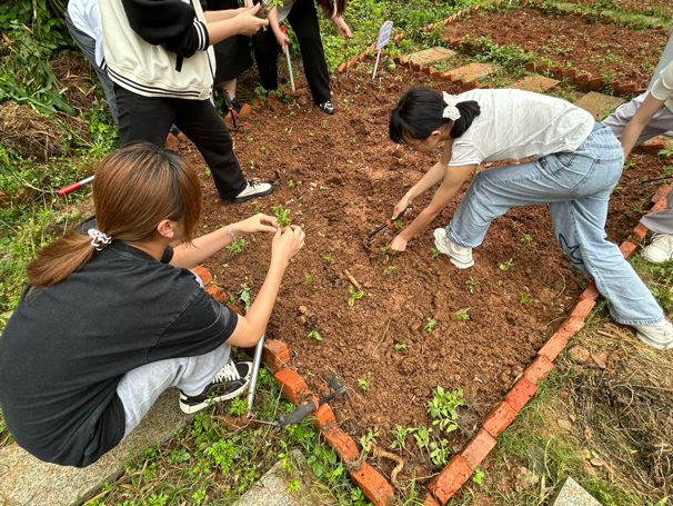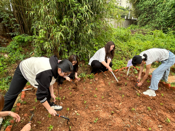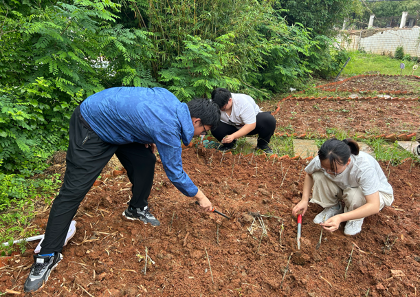 尽管天空下着小雨,但同学们热情不减,分组协作、挥锄铲土、清理杂草、分苗栽种、覆土浇水,每一步都一丝不苟,短短一小时便完成了3块责任田的种植任务。“第一次知道薄荷要种在阴凉处,艾草却喜欢阳光,劳动真是门大学问!”2024级汉语国际教育员工王昭炜边擦汗边说。