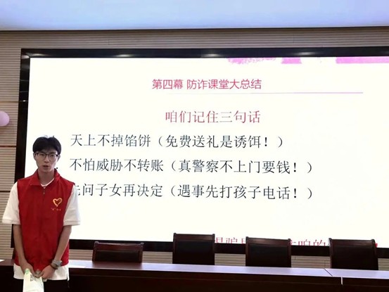 活动伊始,实践团成员自编自导自演的反诈情景剧《守护咱的钱袋子》在社区活动室精彩上演。剧本聚焦老年人最易遭遇的保健品诈骗、冒充公检法诈骗、熟人借钱诈骗等三类高发骗局,通过生活化、轻喜剧的表演形式,真实还原了骗子行骗话术和受害者的心理活动。