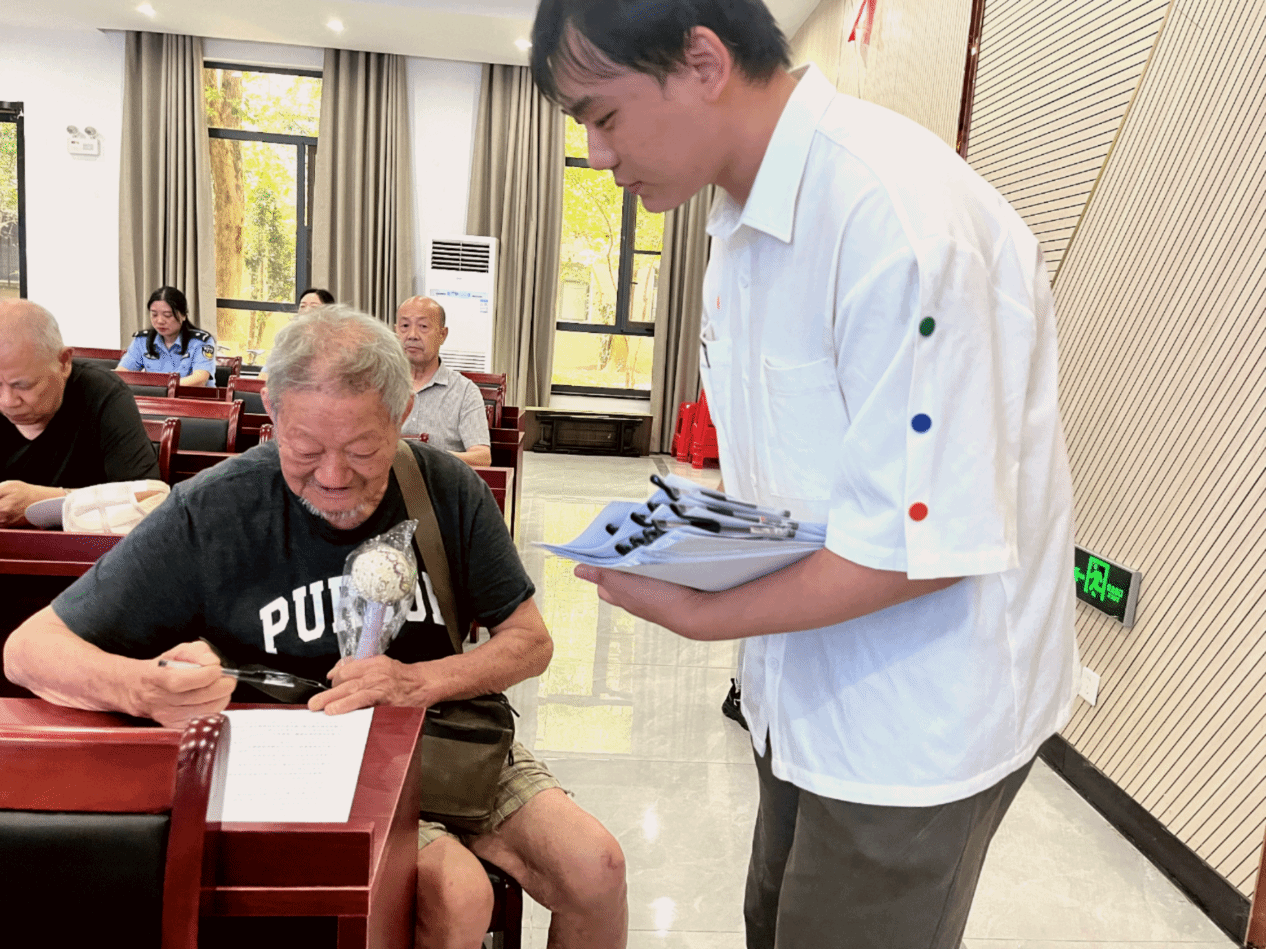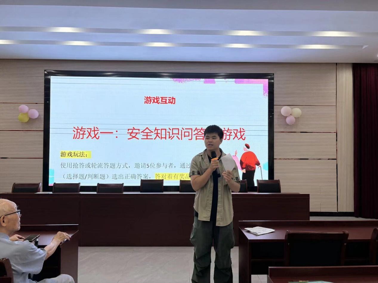 情景剧之后,实践团精心设计的“防诈技能大闯关”互动游戏点燃了老人们的参与热情。活动设置了两大主题互动游戏。一是真假电话我来辨。老人们随机抽取包括“孙子借钱”、“医保卡异常”、“中奖缴费”等场景的情景卡片,现场辨别是否为诈骗电话。李奶奶凭借敏锐观察,准确指出“中奖缴费”电话“连区号都没有”的破绽,赢得了代表“心明眼亮”的定制蒲扇。二是安全知识抢答赢清凉。主持人围绕夏季用电安全、饮食健康、防火防盗等生活常识抛出问题。“电热毯能否整夜使用?”主持人话音刚落,张爷爷洪亮的回答“不能!睡前要断电!”便赢得阵阵掌声。抢答声此起彼伏,现场气氛热烈。