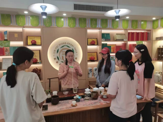 活动中,金苔香茶叶有限公司负责人热情接待了刘煜老师一行,带领师生们参观了企业的茶叶生产车间、产品展示区和茶文化体验馆。在参观过程中,负责人详细介绍了茶叶的种植流程、制作工艺、品牌文化以及海外市场的拓展情况。他提到,随着企业海外业务的不断扩大,急需一批既懂外语又了解茶叶知识和国际贸易规则的人才,以助力企业更好地进行国际市场推广、客户沟通与合作洽谈。