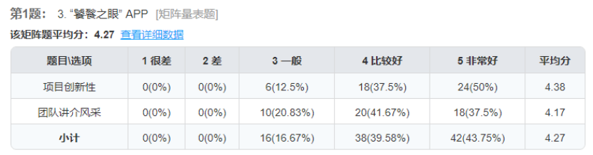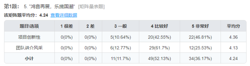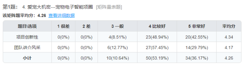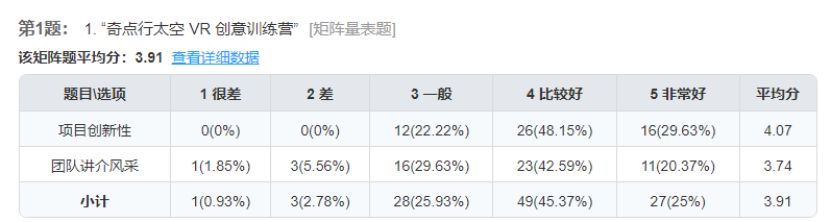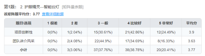 初赛主要是通过商业策划书来进行评比。班级同学对于商业策划书每个项目创意、项目执行概要等内容通过问卷星进行匿名投票,每个同学挑选出最佳的五个项目,最后按照得票率排名最高的五个项目进入决赛展示环节。这5支队伍的项目分别是“奇点行太空VR创意训练营”、护眼精灵——智能台灯、“饕餮之眼”APP、爱宠大机密——宠物电子智能项圈、“鸿音再展,乐揽国潮”。