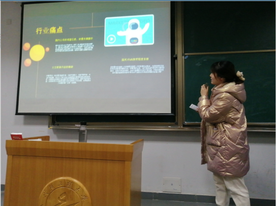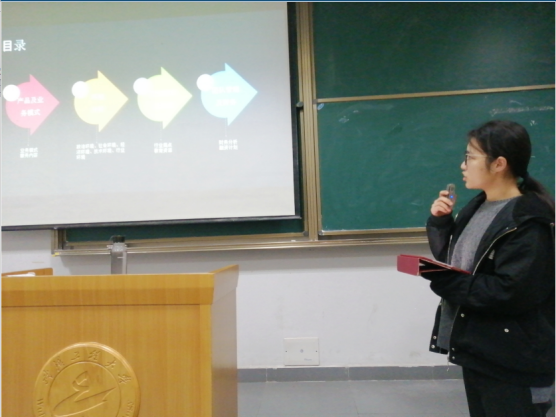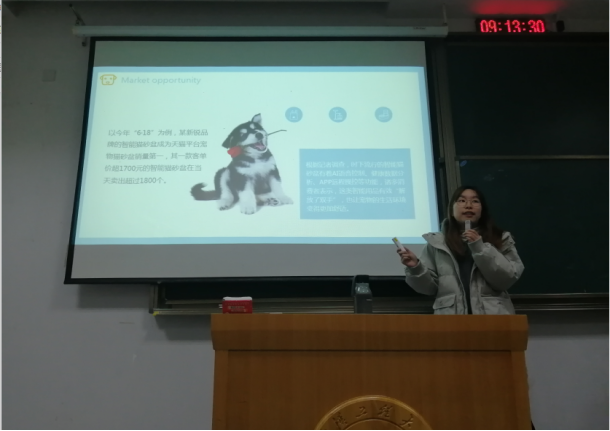 l <![endif]>第四组是来自E+会计02班的蒋心怡、李金秋同学,她们为我们介绍了一款专门为宠物量身定制的管理型项圈,通过与社区、宠物诊所联合,将宠物圈划入智能化时代。