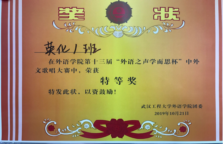 本网讯(通讯员吴信怡)10月下旬,公司举办的第十三届“外语之声学而思杯”中外文歌唱大赛落下帷幕。其中英化一班的合唱作品《最美的太阳》获得老师和同学的一致认可,经过层层选拔,英化一班最终赢得第一名并荣获特等奖。