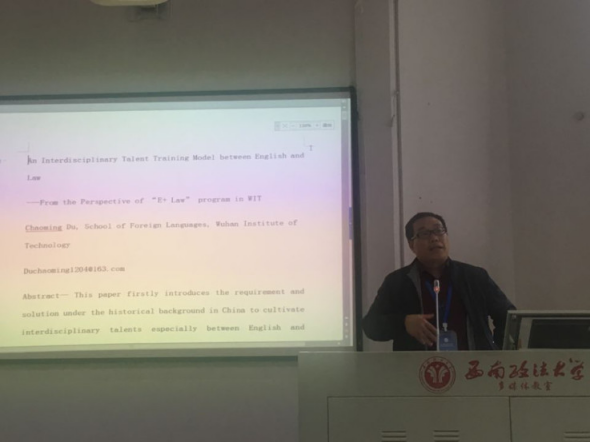 beats365“英语+法学”专业负责人杜朝明副教授应邀参加会议并以“AnInterdisciplinary Talent Training Model for English and Law”为题做了英文发言。杜朝明老师首先向参加会议的代表系统介绍了公司“E+”项目的发展历史、运行模式、目前状况以及面临的挑战和问题。接着,他以“E+法学”专业为例,用“橘生淮南则为橘,生于淮北则为枳”为喻,说明由于法律体系、法律制度、法律规定的不同,同样的法律概念、法律行为、法律理论甚至同样的司法案例在以不同语言为载体的法律环境中(英文和中文),人们的理解、表达、应用和处理也会迥然不同。在此背景下,就如何确定法律英语的教学内容、教学方法、教学实践及测试等问题,同参与会议的代表进行了深入的交流。