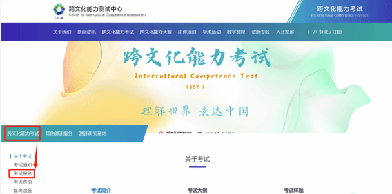 登录跨文化能力测试中心网站(https://ict.sflep.com/),进行在线注册、报名及缴费。建议考生使用电脑端登录操作。(如下图)