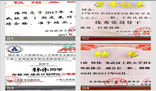 在校期间,韩伟同学认真学习,获得了二等综合奖学金、“优秀员工干部”和校“管理精英”等荣誉称号,并完成中南财经大学工商管理双学位的学习。本专业平均分在83.1分以上,双学位每门课分数在87.4分以上。于大二上学期通过大学英语六级,下学期通过英语专业四级。以下是部分具体获奖内容: